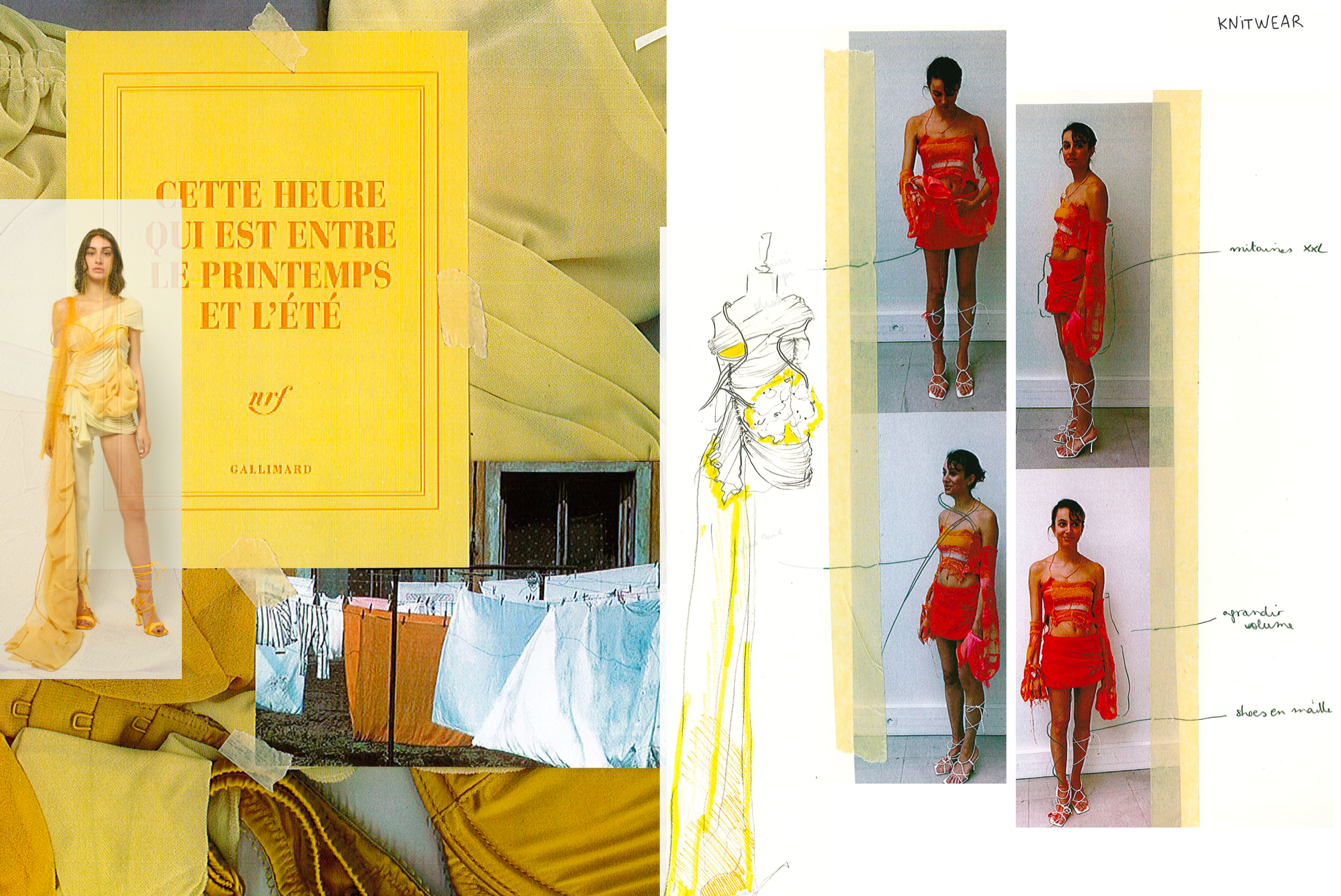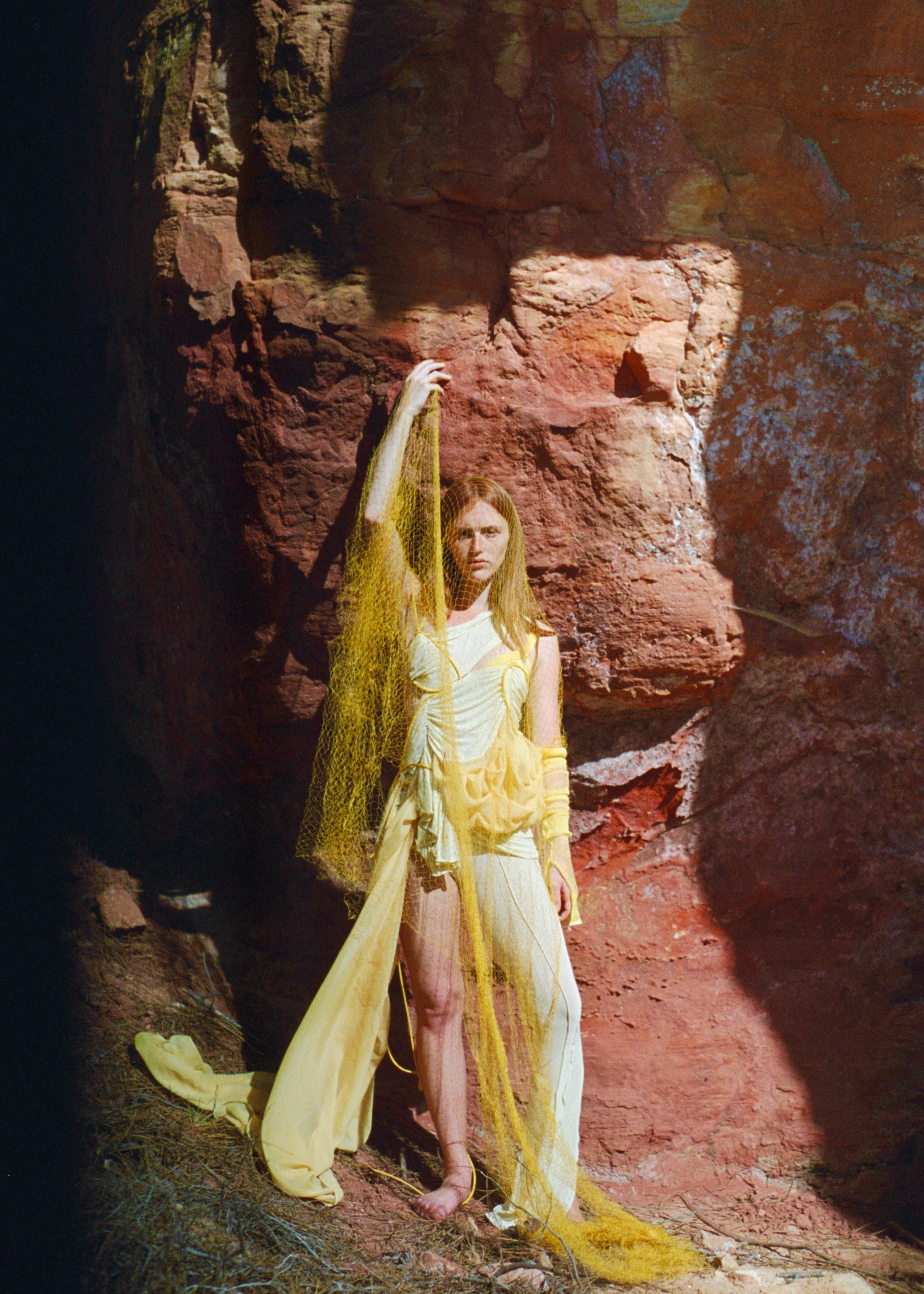 French model Léna Ballayre wears a 100% handmade ensemble, created in shades of yellow, rust, and dust, colors drawn directly from the mineral palette of the land.The piece, entirely crafted in silk, with a veil made from fisherman’s net, was designed as a continuation of the landscape.