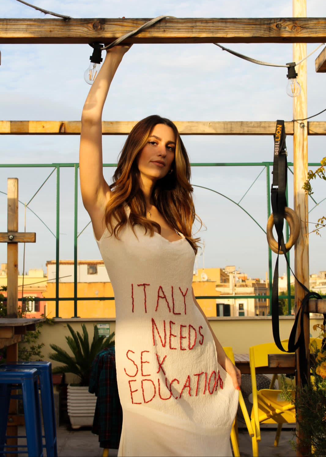 In the summer of 2024, Osha created a bespoke embroidered dress for activist and political candidate Flavia Restivo, as part of her campaign "Italy Needs Sex Education."