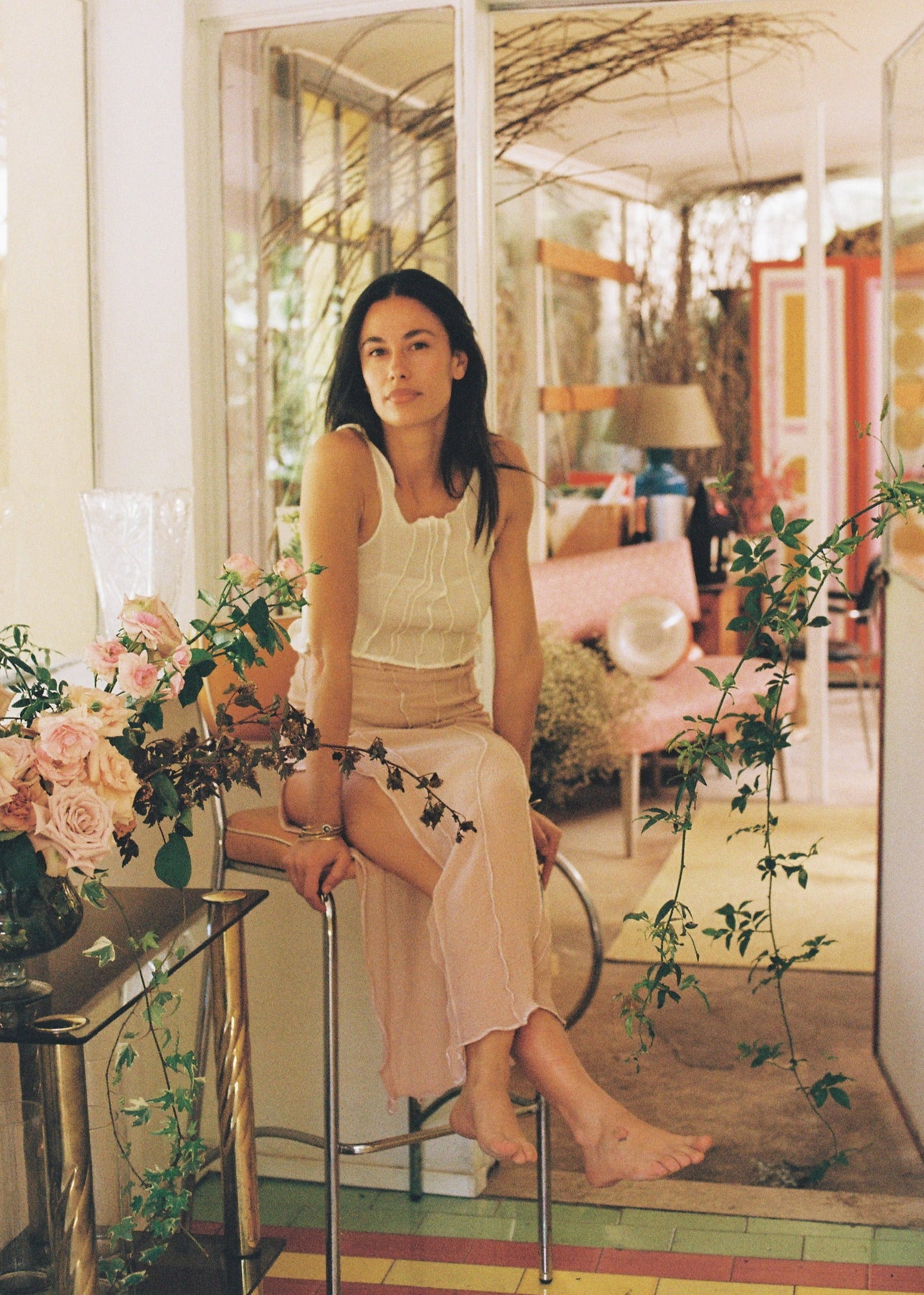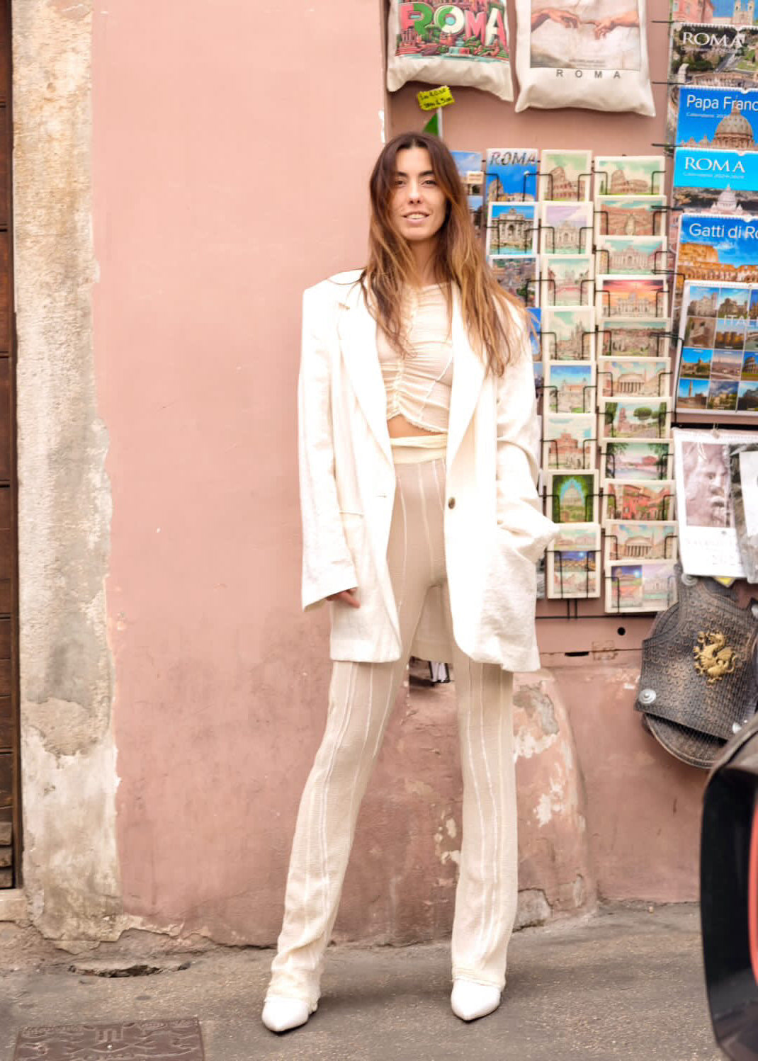 Wearing Osha handmade bustier "Miele" dress, Vittoria Barbagallo embodies a figure suspended between two worlds, France and Italy, past and present, stillness and gesture.