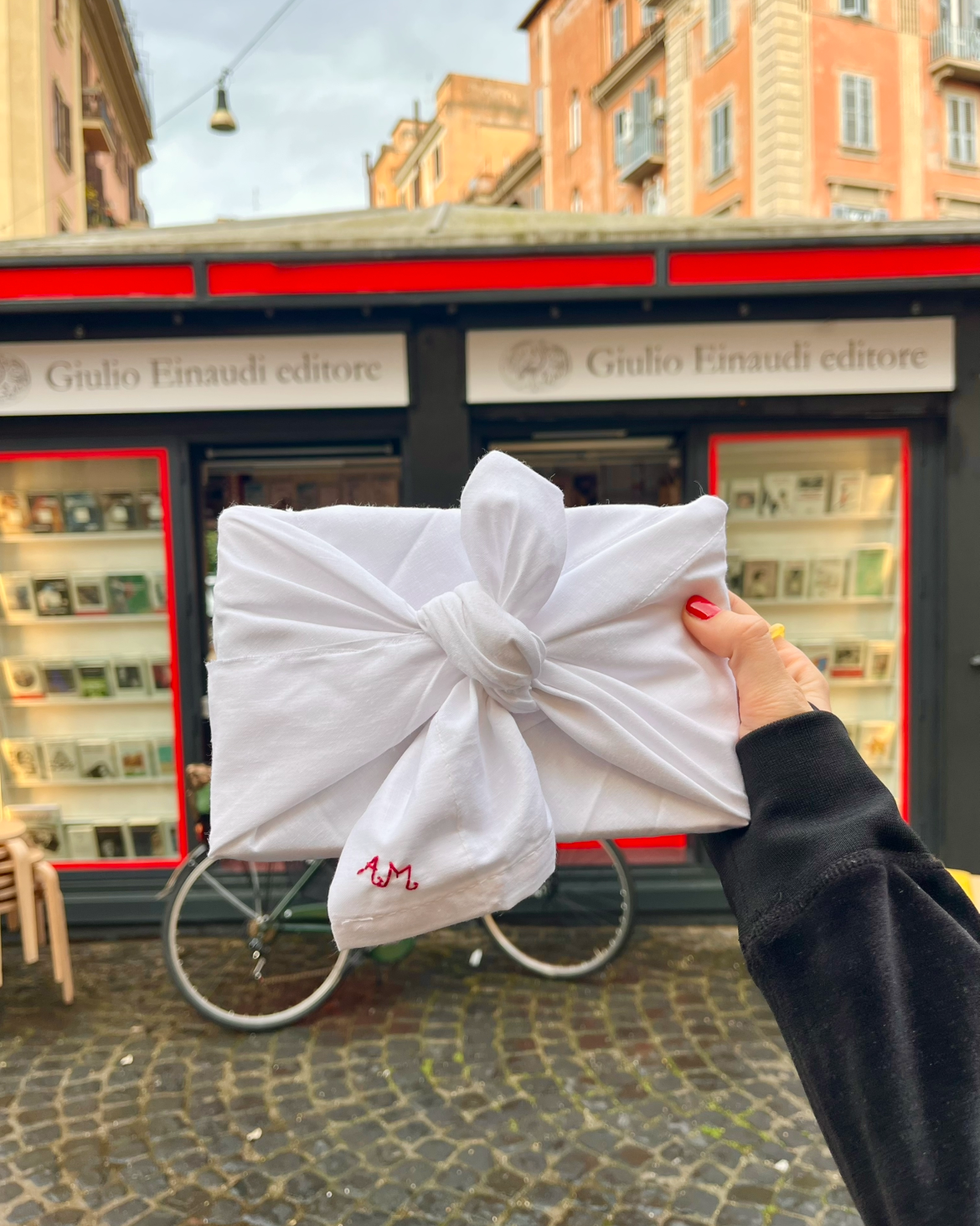 For a special evening with Einaudi, OSHA brought the ancient Japanese art of fabric gift-wrapping to Edicola Erno, each book wrapped by hand in textile, tied and folded with care. Initials were embroidered on the spot, turning every package into a personal object, a small keepsake to carry home alongside the words inside.