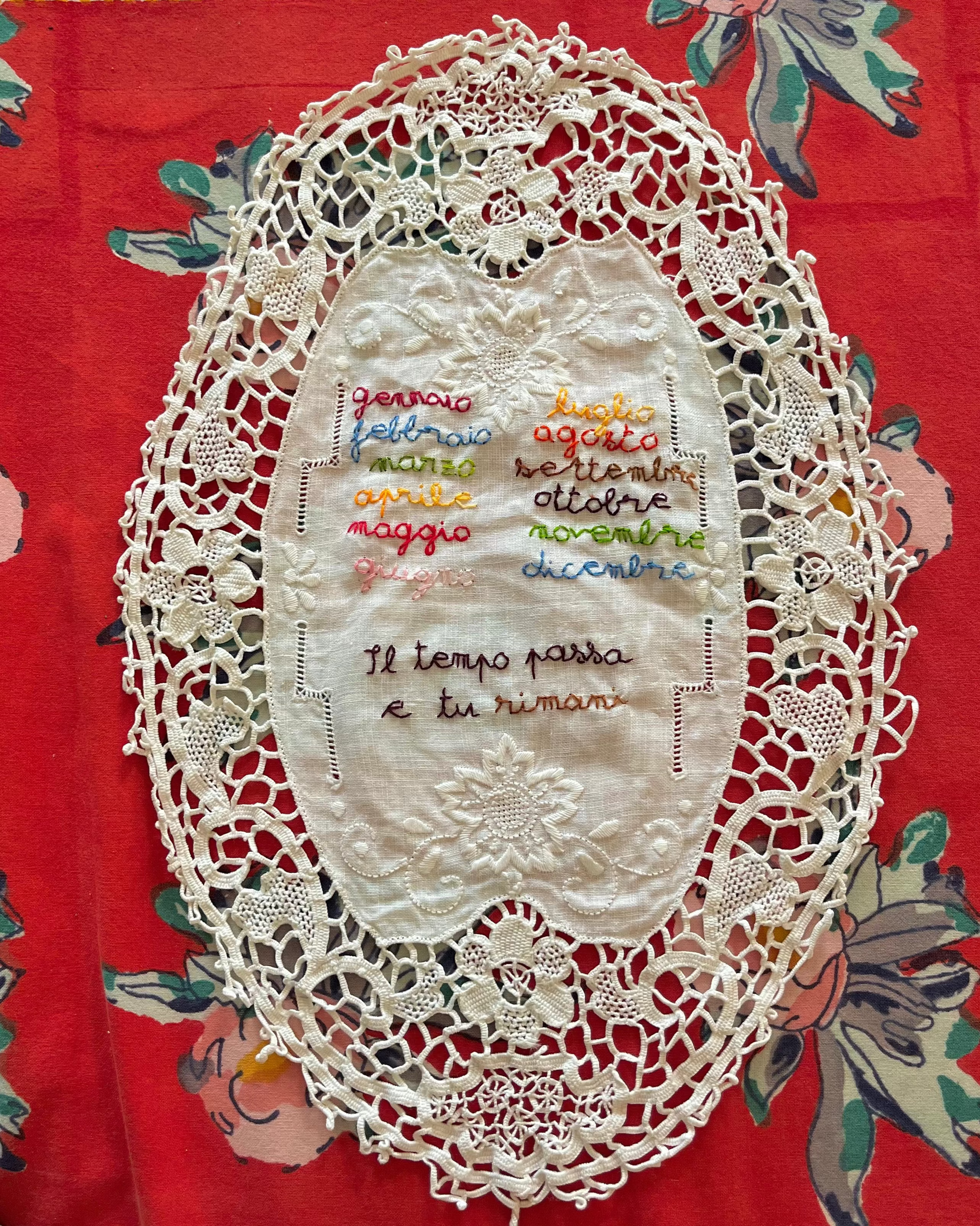 Each month is stitched forming a rhythm across the textile, like a journey through the year.
