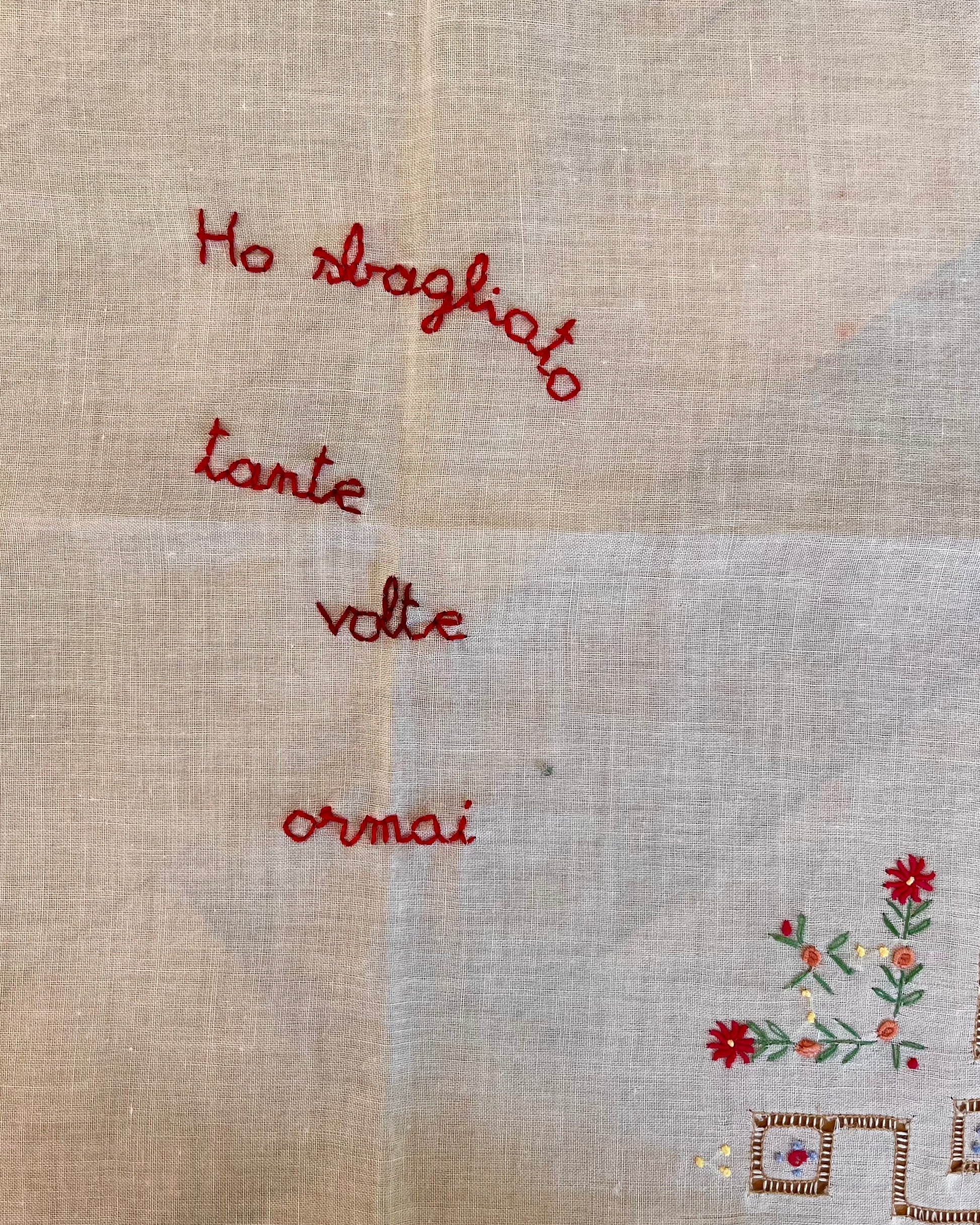 An old hand-embroidered handkerchief, preserved with care and carrying the beauty of its imperfections.